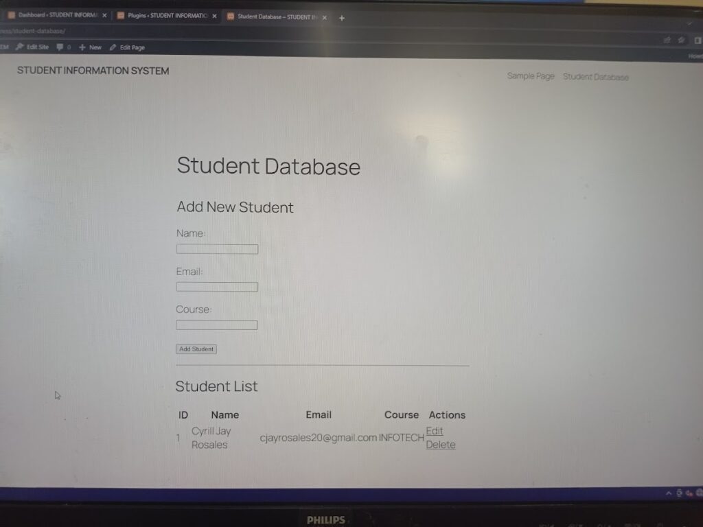 In this activity, I learned how a CRUD system works by performing Create, Read, Update, and Delete operations. I understood how data is added, displayed, edited, and removed, and how WordPress can manage data dynamically through a custom plugin.